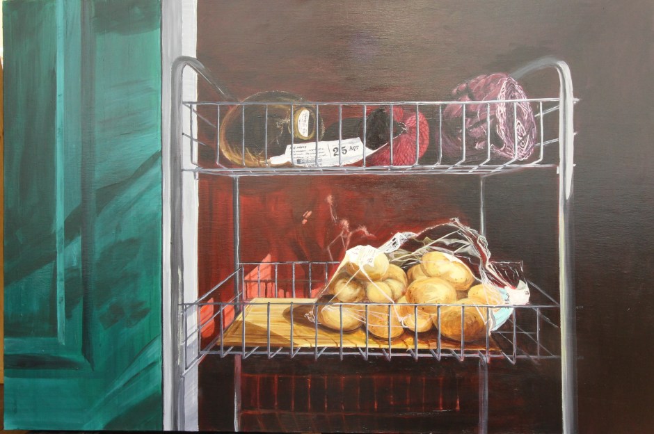 In my painting I approach the work with contemporary materials, such as Acrylic and acrylic glazing medium to create my Covid 19 ‘lockdown’ painting. Although minimal in my approach, there are subtle nods to the excesses of modern life, such as the shiny packaging that attempts to preserve the contents yet stifle the planet in one fell swoop. Cotan was responding (possibly) to the scientific breakthroughs of his day, through the mathematics of the hyperbole, time and space. Cotan was also preserving his pantry by hanging the vegetables to protect them from bruising, whilst at the same time depicting the movement of the planets; moving, rotating vegetables would have been a nightmare to paint. I did not have such problems; these discoveries had already been made. For me for me the context of the everyday was far simpler. My bargain basement Wilko trolley had to be elevated at least within the treatment of the subject matter; chiaroscuro lighting, dramatic colour, and attention to detail. The painting does not faithfully replicate real life; it’s still an artifice, made grander by my choice of colour. In real life, the scene is far more mundane. I wonder what Cotan would have made of today’s wasteful, dystopian world through my dumbed down Druids Heath still life? Cotan looked through the lens of wonder; would he look through my lens and wonder?